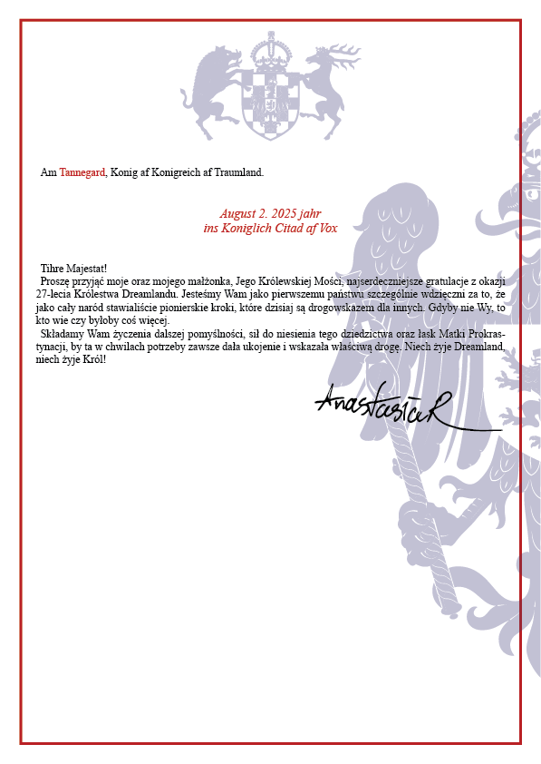 Cudo!!!Wojciech Bombina pisze: ↑21 lip 2025, 16:07Pstryk!Anastasia Windsachen pisze: ↑21 lip 2025, 14:46Imię: Anastasia Windsachen von Ribertrop