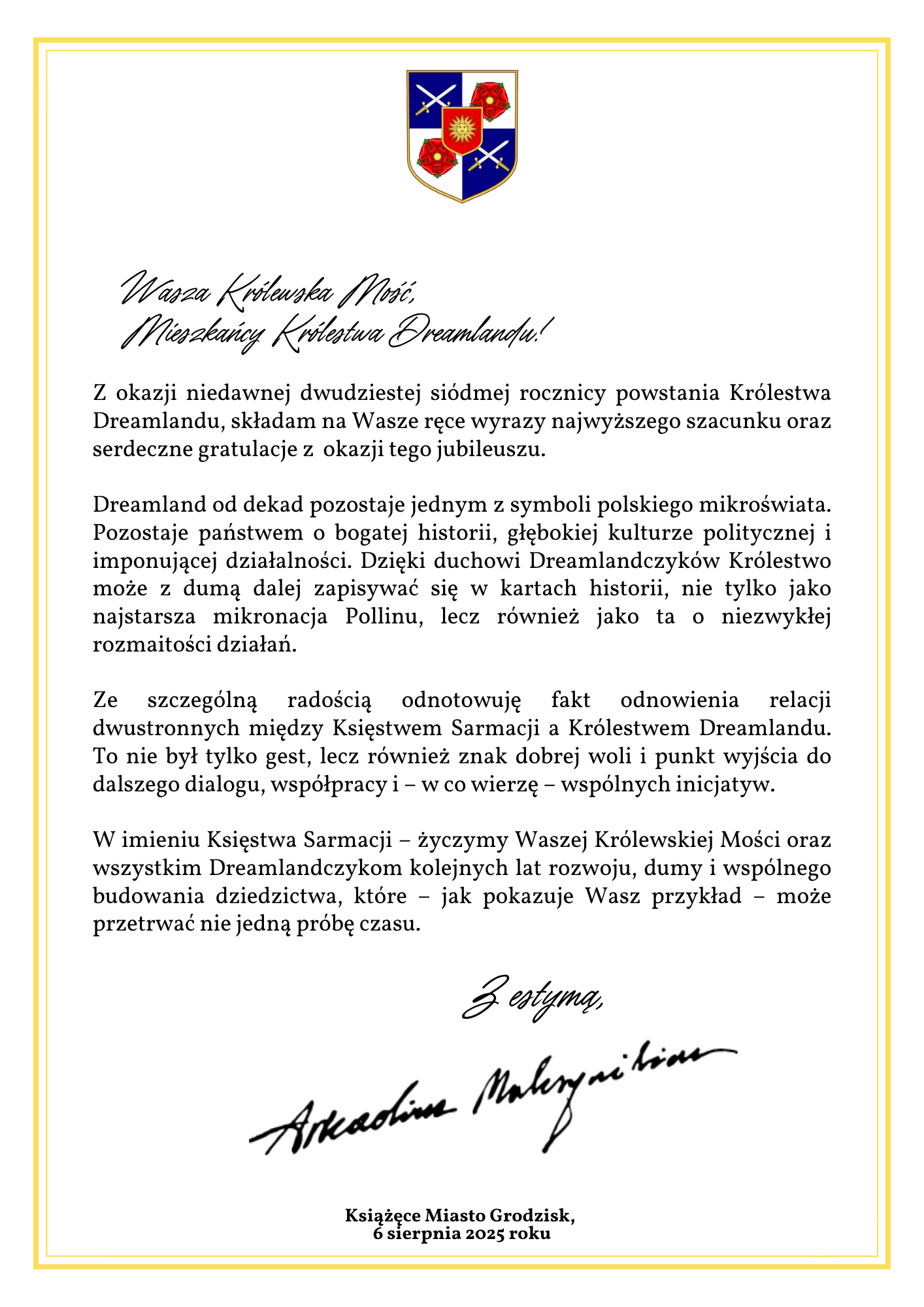 List gratulacyjny z okazji 27 rocznicy powstania Królestwa Dreamlandu