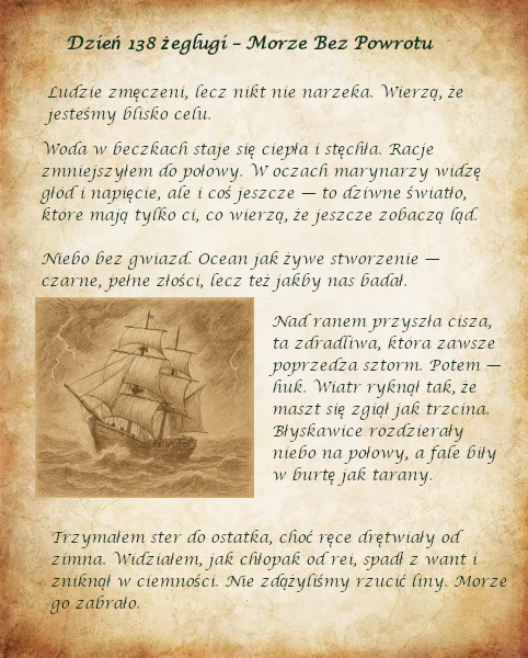(...)Podążali za tajemniczą jednostką z Dreamlandu niemal cały tydzień, a tu ni z tego, ni z owego w gwałtownym sztormie widzą przy burcie młodego człowieka ledwo utrzymującego się na powierzchni morza.